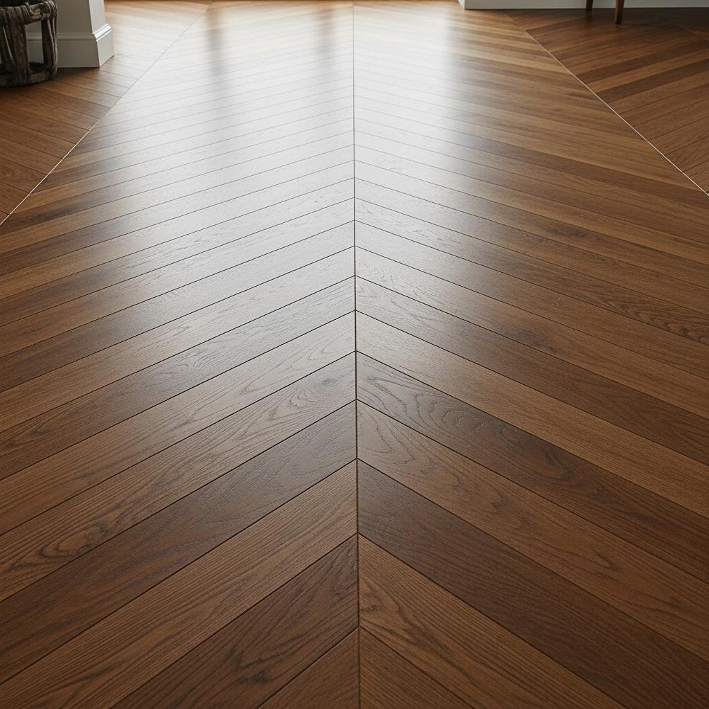 Chevron uses planks that are cut at an angle (typically 45 or 60 degrees). When laid, these planks meet at a perfect point, forming a true "V" shape or arrow pattern that creates a clean, uniform, and elegant look.